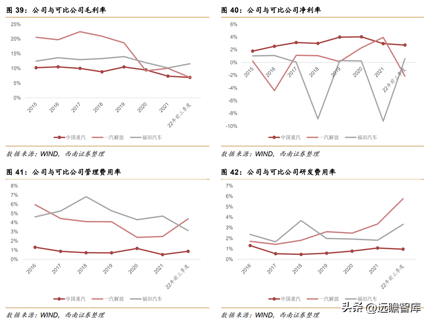 纵向来看,2019年公司毛利率达到10.5%后持续降低,最新22年前三季度毛利率6.9%,同比下降1pp,2020、2021年下降主要是由于2021年7月全面推行国六,所以2020-2021年对国五重卡进行促销,2022年毛利率继续下降的原因在于行业销量大幅下滑,产能利用率大幅降低。