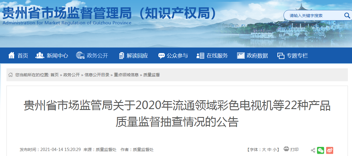 中近日,贵州省市场监管局发布了2020年流通领域彩色电视机等22种产品质量监督抽查情况的公告。