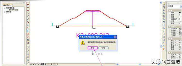1)、当前设计项目没有标准横断面数据。首先打开之前保存的dwg图形格式文件(其中带有标准横断面的模板),系统会提示“打开DWG图形文件包含有标准横断面,是否将其中的标准横断面添加到本项目”,选择“是”,即可将dwg图形文件中带有标准断面的模板添加到当前项目中来了。