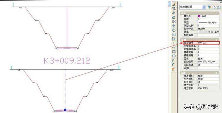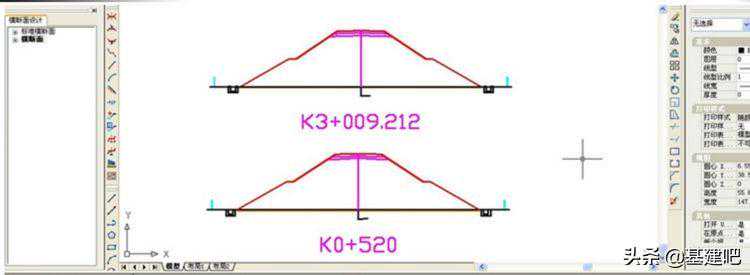 即复制之前已经完成的某一个项目的标准横断面、或者本项目中已经完成设计的路段的标准横断面,来创新当前项目和路段的标准横断面。该方式的具体操作非常简便,仅使用常用的键盘“复制”组合命令(“Ctrl+C”)和键盘“粘贴”组合命令(“Ctrl+V”)即可完成。对于一个项目有多个标准横断面的情况,我们可以复制粘贴已经定制好的标准横断面模板,然后在CAD特性参数中将桩号改为需要的数值即可,如下图所示: