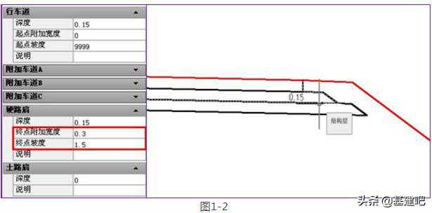 Soeasy!只需选中标准横断面结构层,在特性参数中修改其起点或终点坡度,如需延伸至某个固定宽度,设置其起点或终点附加宽度即可。如图1-2,1-3: