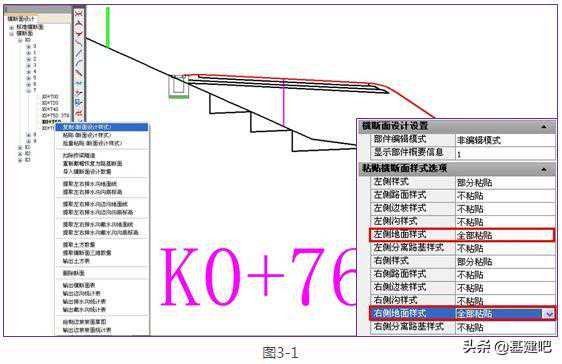答案:“部分粘贴功能”。如图3-1,只把地面线挖台阶复制粘贴到其他断面,在桩号树该桩号右键选择复制断面样式,特性窗口即可出现粘贴横断面样式选项,只选择粘贴左右侧地面样式,在批量粘贴对话框中设置桩号区间,即可批量粘贴成功,如图3-2,批量部分粘贴只是将挖台阶样式粘贴,其他部件样式保持原有样式不变。