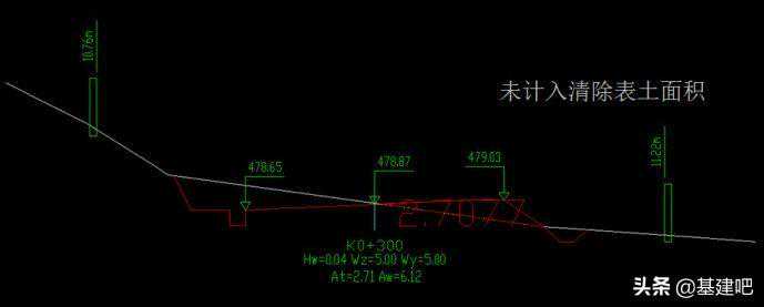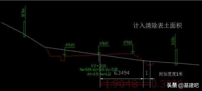 坡脚范围内清表量为6.3494*0.3=1.90482。如果有增加宽度,比如到坡脚了,还要继续清表,需算上增加宽度部分的清表面积(如果是纯填方断面,坡脚两侧均应增加清表宽度),即1*0.3*=0.3,那么总清表面积=1.90482+0.30=2.20482。而从图中我们可以看出,清表后填方面积增加的量4.91‐2.71=2.2,与计算得到的面积相差的只是小数取位的量,若系统输出采用原数据计算的话,将分毫不差。