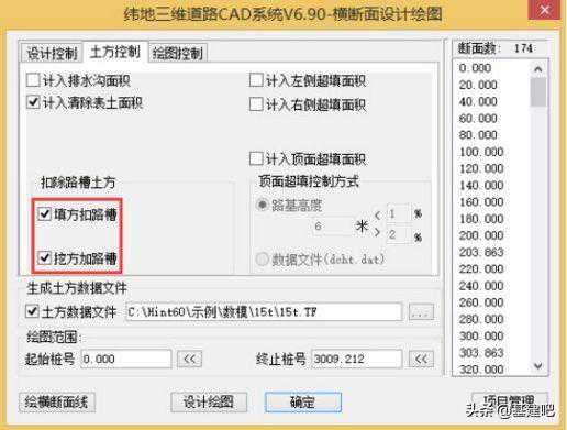 完成之后,我们在进行“横断面设计绘图”进行戴帽时,可以在“土方控制”窗口勾选“填方扣路槽”以及“挖方加路槽”如图所示: