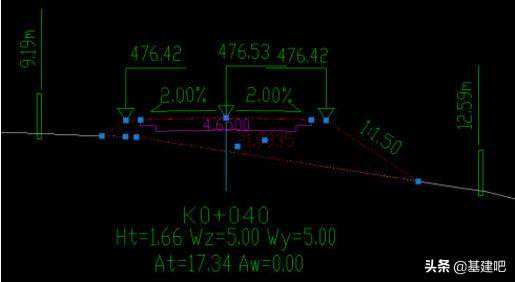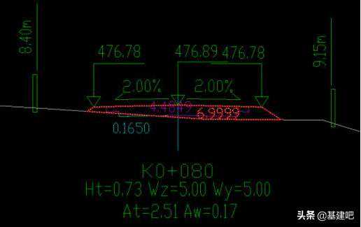 即6.9998-4.4849=2.5149,刨除小数点保留误差,即为系统所得填方面积2.51;深入地面线以下的路槽结构层将计入挖方面积为0.1650。
