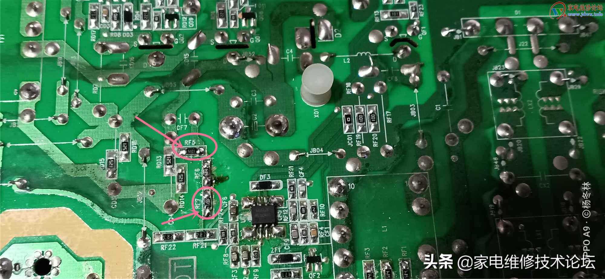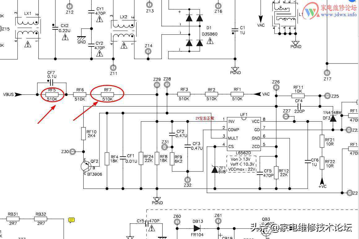 断电,人为泄掉大滤波电容的电压,首先拆掉L6562D的1脚的几个取样电阻RF5RF6RF7来测量:RF6510K正常,而RF5RF7的阻值都变小了!分别为35K,400K左右。立即换掉此两个510K电阻,上电开机,见背光亮起!喇叭也不再"叭叭”响了。测PFC电压已上升到380V了。而12V电压也正常了!接信号线图声正常。谢谢欣赏。(作者:杨冬林/家电维修论坛)