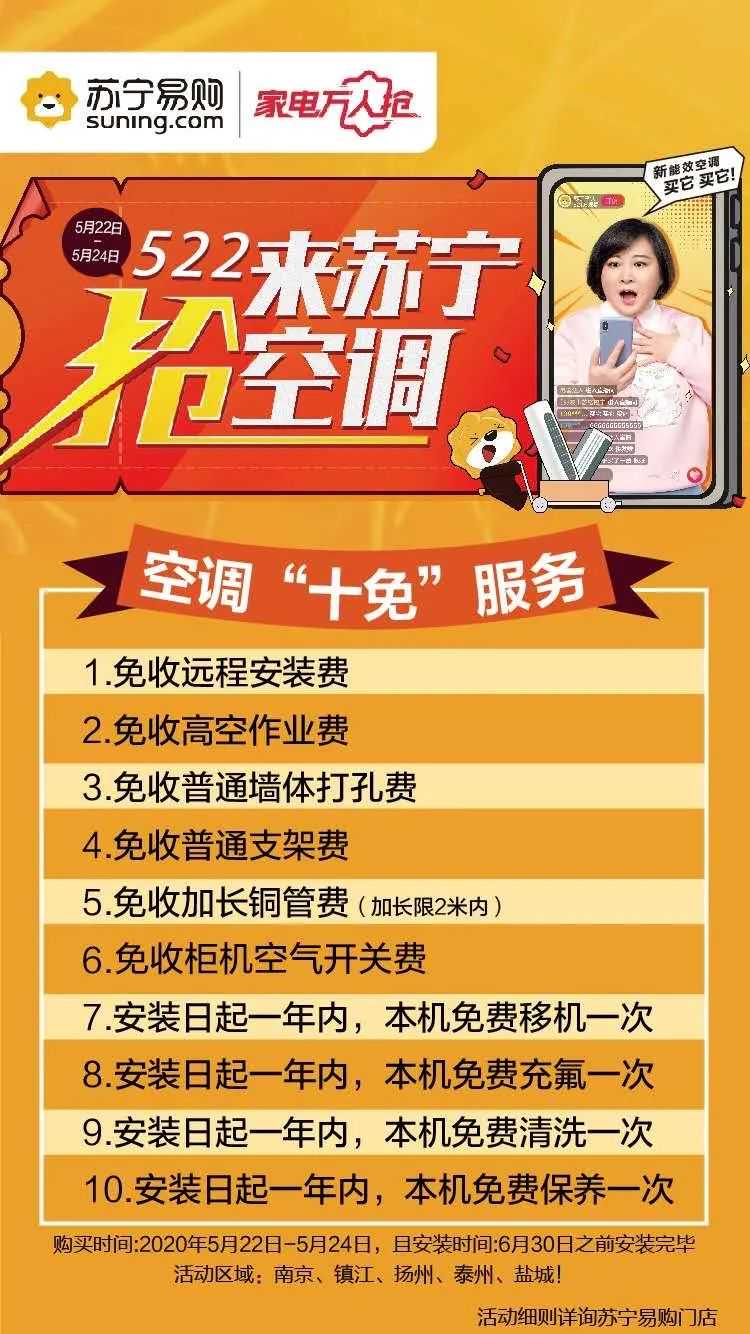 此外,在南京苏宁购买健康空调还可享受“十免安装”:一年内免费加氟、移机、清洗、保养一次,远程安装费、高空作业费、30CM以内打孔费(一次)、两米内管线、普通支架、柜机漏保等十项服务。