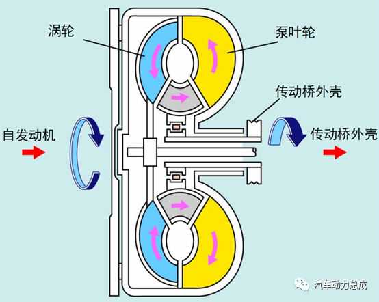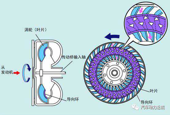 很多叶片安装在涡轮上,如同泵叶轮那样。这些叶片的曲率方向与泵叶轮叶片的相反。涡轮安装在传动桥输入轴上,使涡轮内的叶片与泵叶轮叶片相对,在两者之间由一很小的间隙。