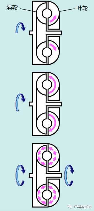 液体从涡轮进入定子的方向取决于泵叶轮和涡轮之间的转速差。