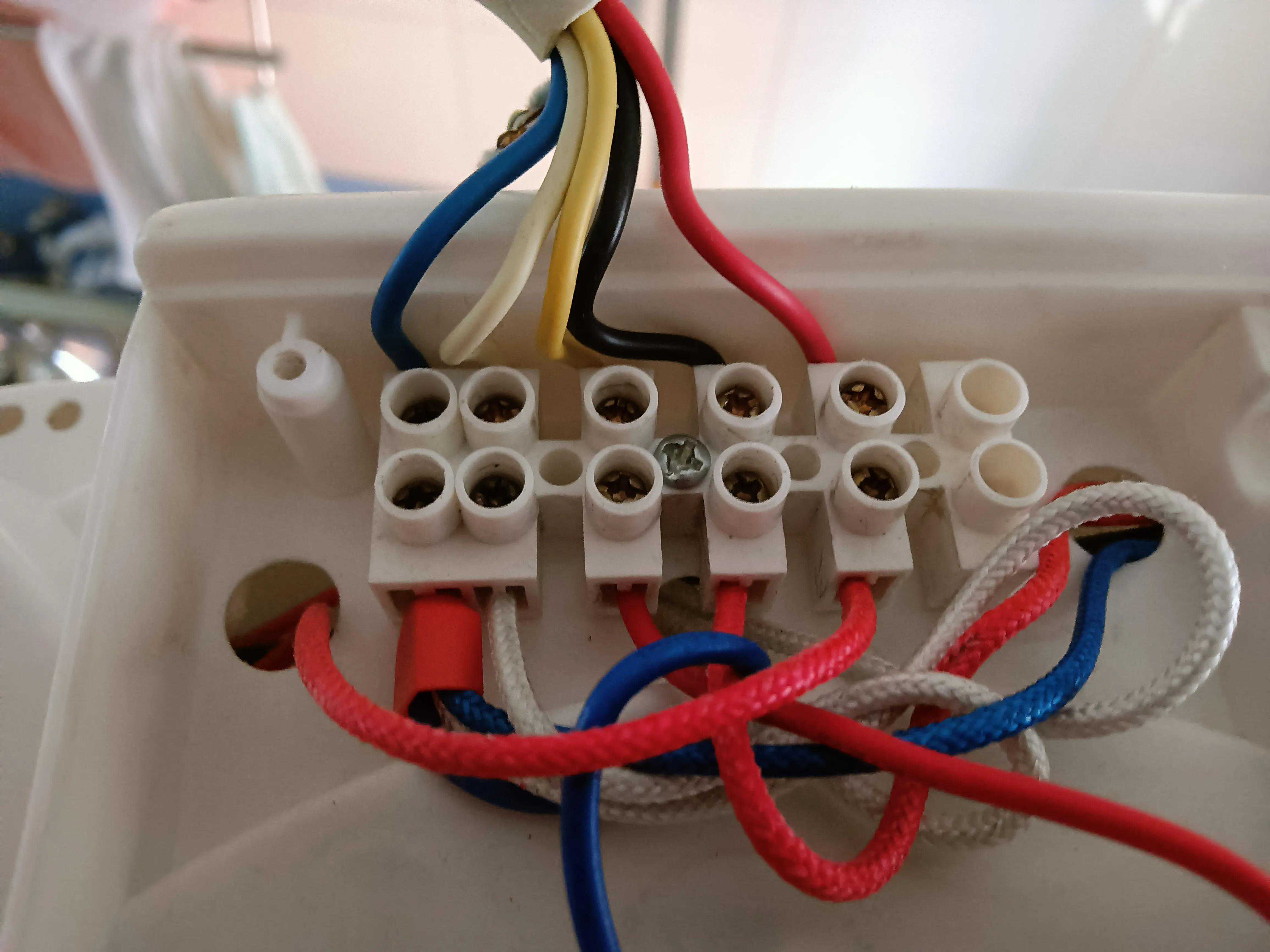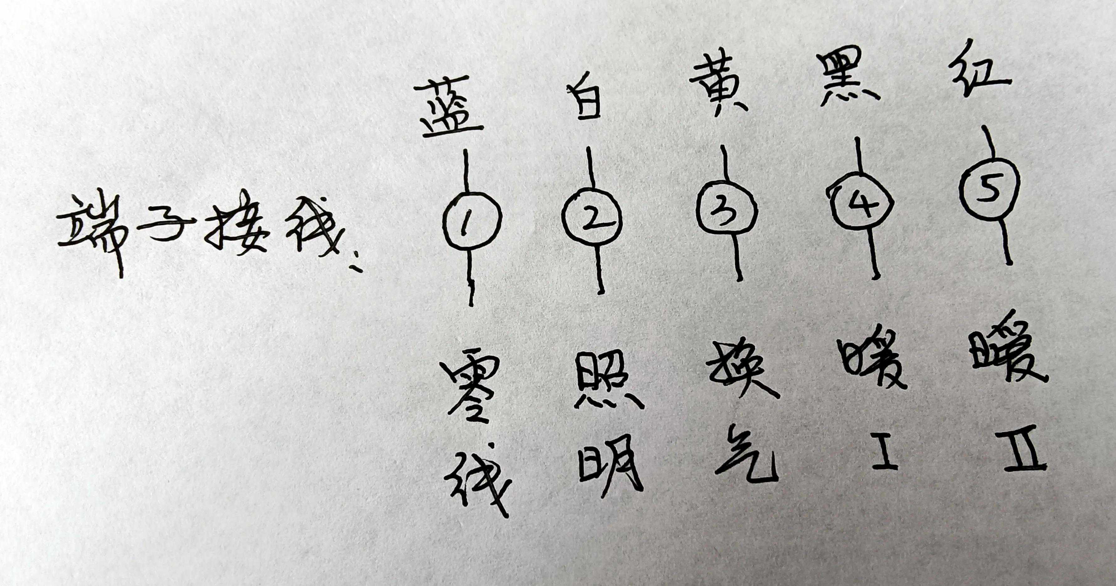 端子线做好标记(如下图),再从端子上拆下这5根线,卸下整个浴霸,拆下换气扇电机。
