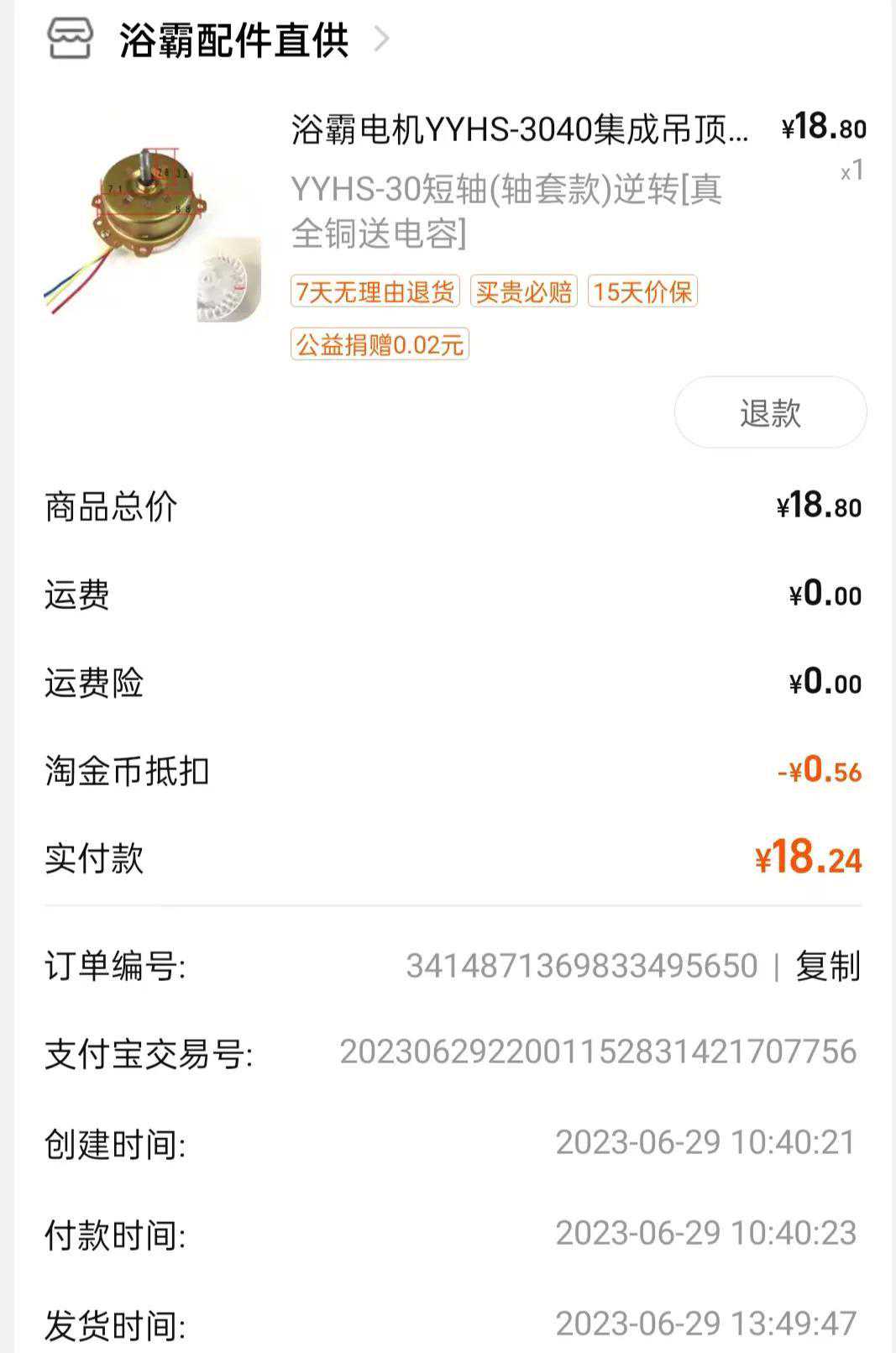 老婆在淘宝上花了18元,购买了一个短轴YYHS-30型(轴套款、送电容)的浴霸换气扇电机。
