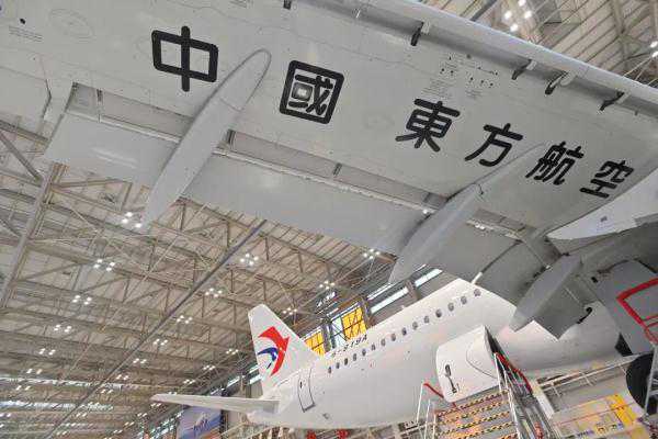 全球首架C919大飞机在商飞机库内交付给中国东方航空。