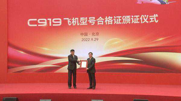 2022年9月29日,C919飞机获颁型号合格证。