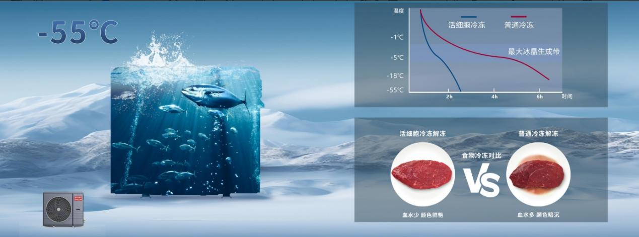除了这款“采暖大佬”产品之外,此次会展上扬子空调还揭秘了另一款“冷库大佬”——扬子冷库空调机组。它创造性地采用了“活细胞冷冻”技术,辅以智慧变频和热氟融霜,可快速达到-55℃库温,具有独特的速冻锁鲜效果,能最大限度地保障食材的新鲜和口感,非常适合深海海鲜的储存和保鲜,如北太平洋蓝鳍金枪鱼、北欧三文鱼等高端食材。
