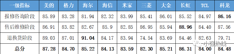 10个空调品牌的整体得分均超过80分,消费者满意度普遍较高。其中,美的空调以87.28分位列第一,其次是长虹空调,消费者满意度得分为86.31分。从三个一级指标得分来看,科龙空调在报修咨询阶段表现较好,长虹空调在售后维修阶段有优势,海尔空调在退换货阶段处于领先地位。