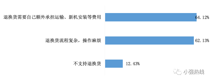 家用空调退换货阶段的消费者满意度得分为83.90分。结合消费者遇到的问题来看,消费者承担运输、安装费用是退换货阶段中最为普遍的问题。数据显示,在体验过退换货服务的消费者中,有64.12%的消费者需要自己额外承担运输、新机安装费用。