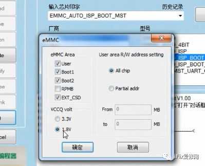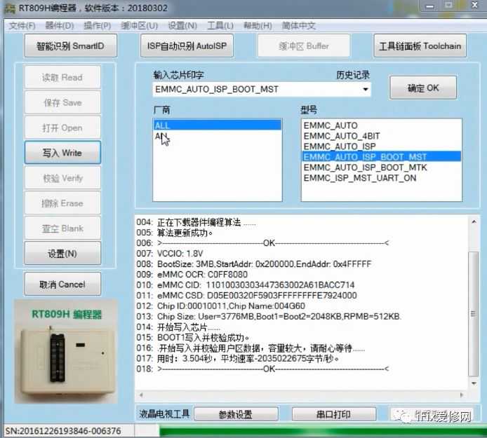 打开编程器操作界面,在RT809H操作界面的输入印字框输入“emmc”,在下面型号框内选“EMMC_AUTO_ISP_BOOT_MST”;