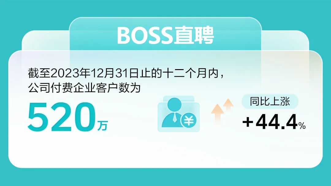 2023年,BOSS直聘营收增至59.52亿元,同比上涨31.9%;经计算现金收款66.85亿元,同比增长44.9%。截至2023年12月31日止的十二个月内,公司付费企业客户数为520万,同比上涨44.4%。