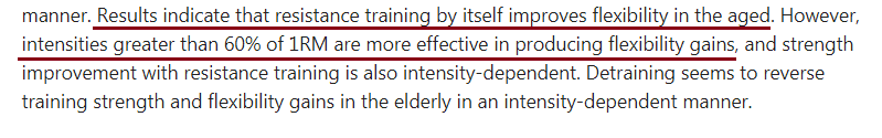 Ioannis等人[4]2016年的研究了6个月的力训和脱训对老年人柔韧性的影响,58名名老年人被随机分为高、中、低阻力力训组和对照组,他们在持续24周(每周3天)的训练中,只做力量训练不做任何柔韧性训练,结果显示所有力训组的老人的柔韧性都提高了,而且力训重量越大,柔韧性提高越多。
