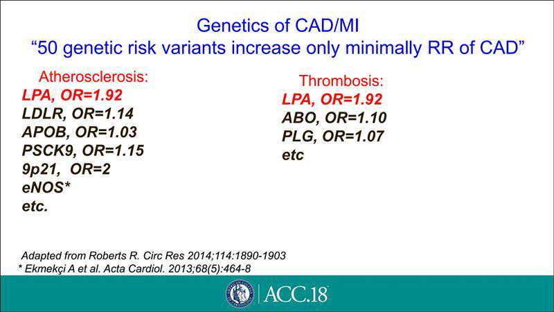RobertsR.等研究了50种与冠心病和心肌梗死风险相关的基因后发现,大多数基因仅轻微增加冠心病风险,而LPA基因的突变不但会大幅增加动脉粥样硬化风险,而且也增加了血栓形成风险[7](图4)。2009年JAMA和NEJM连续发表多篇文章,证实Lp(a)是心血管疾病发生的独立危险因素[8-10]。