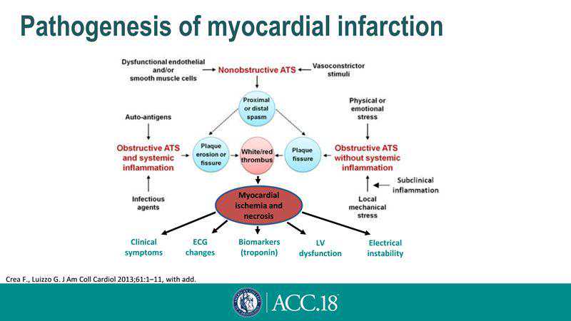 在随后的演讲中,AlexeyYakovlev教授阐述了临床上早发心肌梗死常见的病因和鉴别诊断原则。Yakovlev教授首先从心肌梗死的发病机理阐述了心肌缺血和坏死的原因[16](图5)。早发者心肌梗死的临床特点与非早发患者有所不同。在最新的ESCSTEMI指南中,<40岁的男性患者ST段抬高的定义为至少有两个相邻导联ST段抬高≥2.5mm,不同于40岁以上患者(≥2mm)[17]。