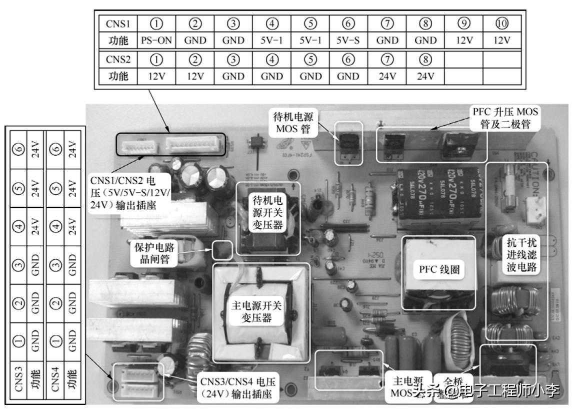 ②给电源板组件CNS1的①脚强行施加一个高电平(5V)模拟二次开机(直接将5V-S短接到CNS1的①脚即可),其他几组电压输出正常,说明电源板是好的;反之,该电源板的主电源部分和PFC电路存在故障。(备注:GP系列电源板组件需要在CNS1或JP804的④、⑤脚与地间加一个5W/2~10Ω电阻作为假负载才有输出。)