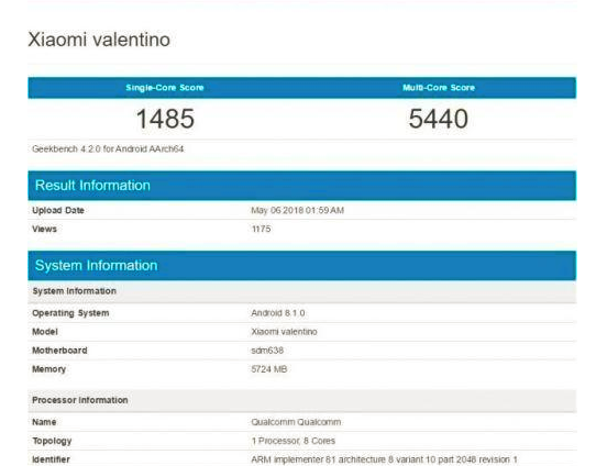 同时,在硬件配置上,从此前Geekbench曝光的信息来看,这款手机代号为“XiaomiValentino”它搭载了骁龙638处理器,多核跑分成绩为1485分,单核跑分成绩为5441分,整体性能接近高通骁龙660处理器水平。根据互联网上的爆料信息显示,这款代号为“XiaomiValentino”的机型很可能就是红米Note6系列。换而言之,红米Note6有望首发高通骁龙638处理器。目前来看,骁龙638作为骁龙636的升级版本,在整体性能上实现较为明显的提升。在此基础上,红米Note6/6Pro将定位于中低端手机市场。