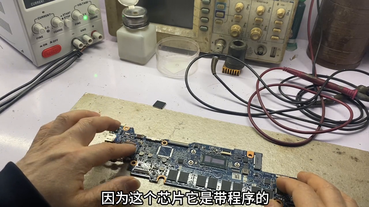 这里要给大家顺便介绍一下什么叫剪板的芯片?就是有芯片的这块小板是从同型号的主板上面剪下来的。这里可能又要问为什么不买一个新的芯片换上去?我告诉你如果是换新的芯片真的还是不好使。为什么这样说?因为这个芯片它是带程序的,如果是从同型号的主板上面剪下来的芯片肯定是带程序的,而新的芯片里面是空的是不带程序的,哪怕装上去以后也不能够正常工作。这样说你明白了吗?