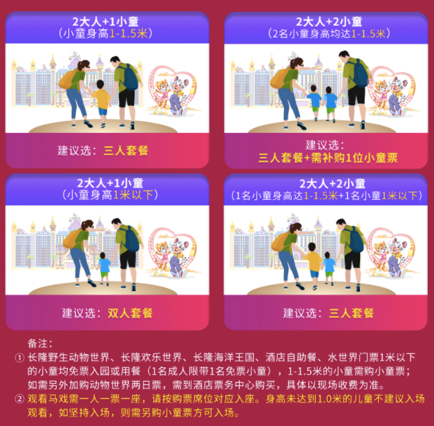 简单来说,如果平日有空的话,选非周末的套餐是最划算的。双园包括动物世界+马戏,三园则在以上基础上多了个欢乐世界。