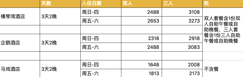 这次双十一3天2晚套餐价格分得比较细,特意做了张表格,可以看得更清晰点: