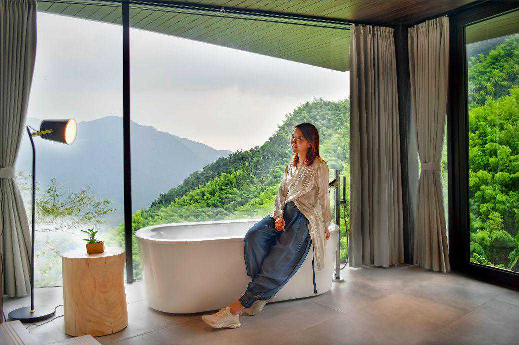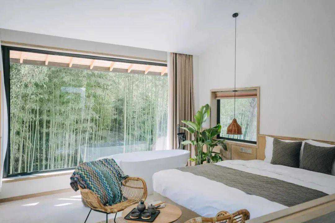 刚刚在松阳成为头部民宿,又在“莫干山的香格里拉”开出了第二分号。只有8间房,隐身竹林山野,大面积玻璃落地窗将山林美景延伸到了室内,美得很。房间里用的备品不输星级酒店,欧舒丹洗漱套装、科勒马桶等等,品质在线。