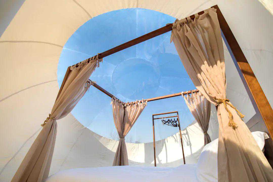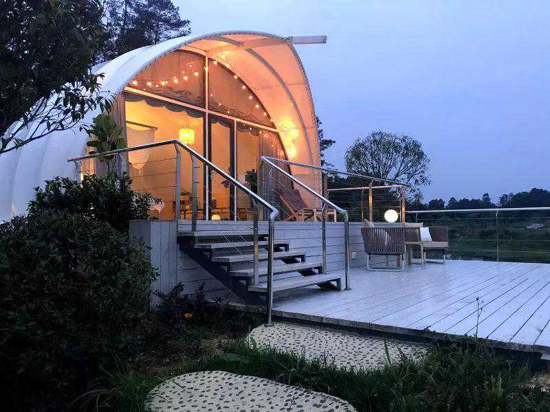 成都民谣里湖景贝壳帐篷民宿选址距离成都1h车程的浦江世外桃源,外观是浪漫的白色贝壳造型,一面世就自带网红光环。