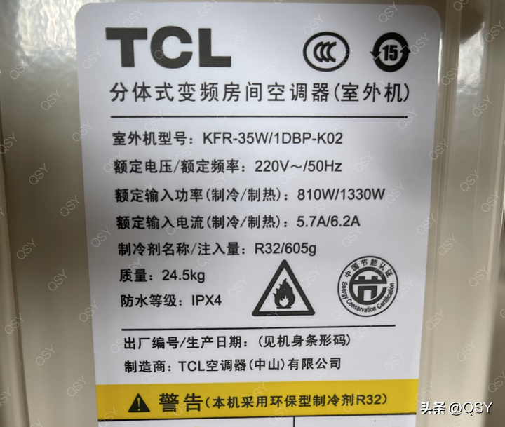 经过拆机确认,TCL小蓝翼Ⅱ1.5匹1级,使用海立GSD095TKTF6JT6B单转子压缩机,排量9.5cc。冷凝器是单排24根7mm铜管总长约19.6米,33w威灵直流电机,三花不锈钢四通阀,使用的是毛细管节流,没有使用电子膨胀阀。