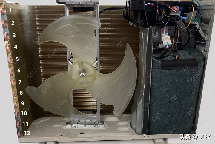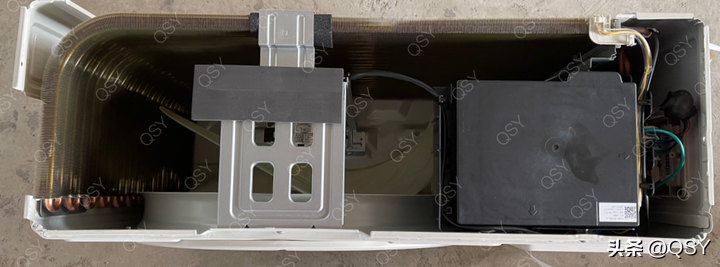 ▲拆开外机顶盖,能看到冷凝器是单排铜管,横置电控板布局防水、防尘、防虫效果更好。