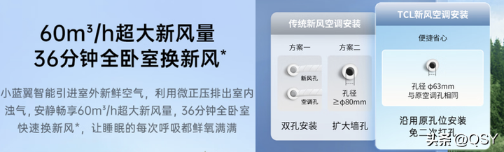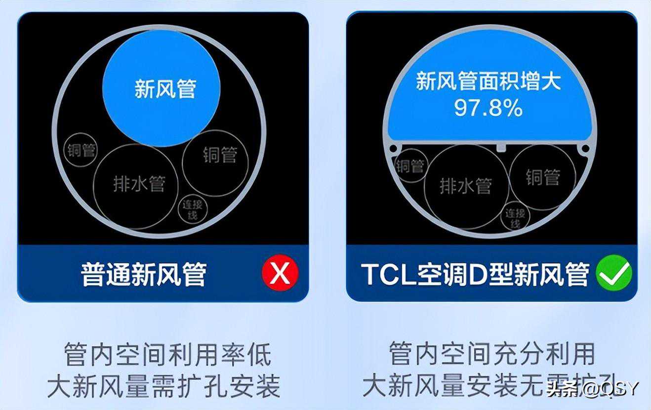小蓝翼Ⅱ采用D形新风管方案,相比主流φ30mm新风管,横截面积增大97.8%,因此做到标准φ63mm开孔,就能做到60m³/h新风量,在不扩孔大新风方案中,TCL是领先的。