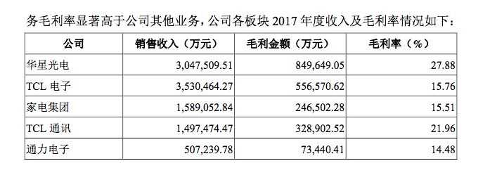在2017年,华星光电毛利率为27.88%,的确远高于其即将剥离的产业15%左右的毛利率。