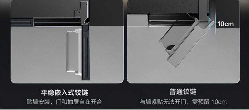 那么左右零缝隙,会不会存在影响冰箱开门、散热呢?普通冰箱的铰链与墙壁是紧贴的,故而最少得预留10cm的距离才不影响开门幅度。TCL薄嵌冰箱T9采用的则是平稳嵌入式铰链,贴墙安装,门与抽屉自在开合,因此90°开门无影响。即使是家中无橱柜式的装修,贴着墙摆放,依然不影响开门,高效利用每一寸空间!