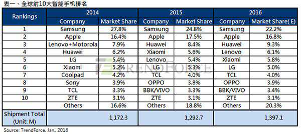 2015年三星智能手机的市场份额依然超过了20%,位居全球第一,虽然相比2014年,三星智能手机的市场份额下滑了三个百分点。但随着S7/S7Edge的发布,相信在2016年三星优势会继续延续。