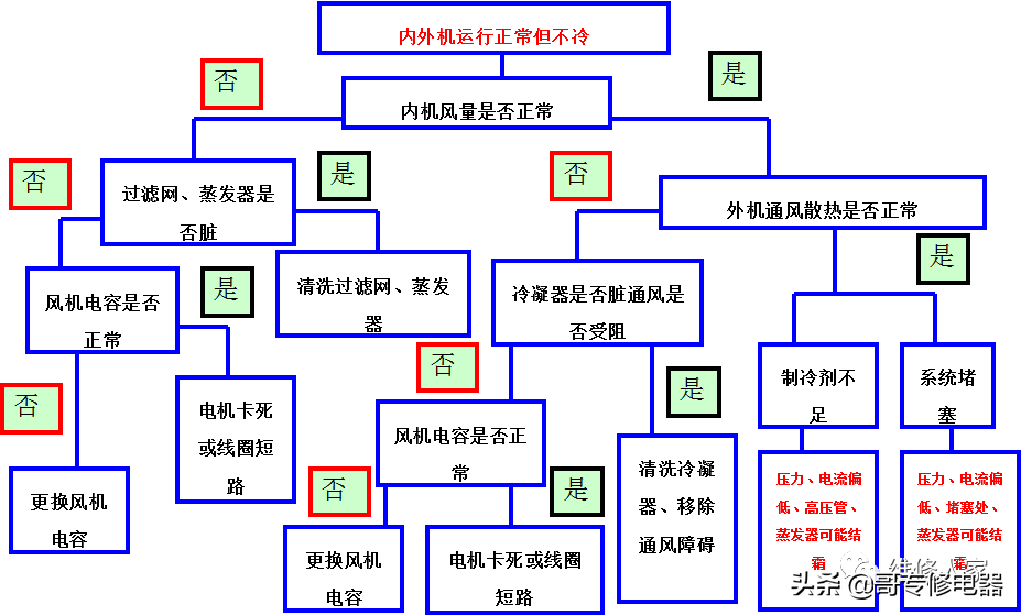 一般来说,如果内风机、外风机、压缩机运行正常,但不制冷,故障一般出在制冷系统部分,再通过检测压力、温度,观察各部位的结霜、结露情况,就可判断故障原因所在。