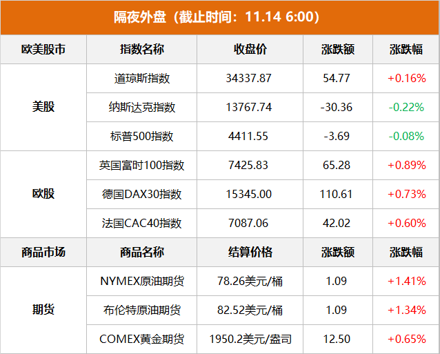 国际原油:国际油价13日上涨,截至当天收盘,纽约商品交易所12月交货的轻质原油期货价格上涨1.09美元,收于每桶78.26美元,涨幅为1.41%;2024年1月交货的伦敦布伦特原油期货价格上涨1.09美元,收于每桶82.52美元,涨幅为1.34%。