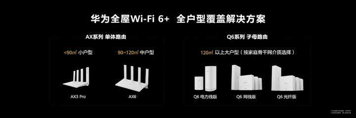 为了满足不同家庭的网络需求,华为这次推出了两套上网组合方案:针对小户型的华为路由AX6和针对大户型的华为路由Q6。