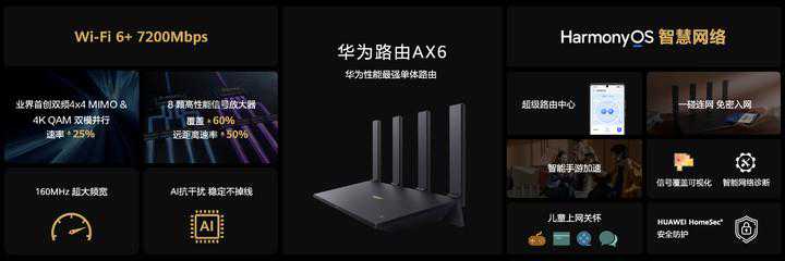 华为路由AX6是一台单体路由器,速率可达7200Mbps,拥有8颗高性能型号放大放大器,轻松穿透3堵墙。华为在发布会上表示,这是性能最强的单体路由器。