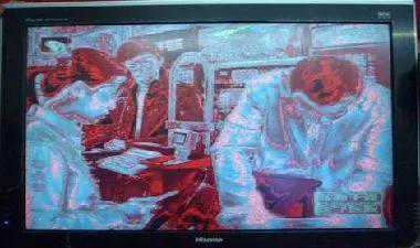 分析检修:从出现此花屏故障现象上看应该与LVDS编码及LVDSD线无关,因为整幅图像呈现的是¡°鬼脸¡±现象.那么故障部位应该在逻辑板上,可能是主板过来的LVDS差分信号没有全部送入到T-CON板的格式变换器.或是T-CON板上格式变换器本身工作不正常.