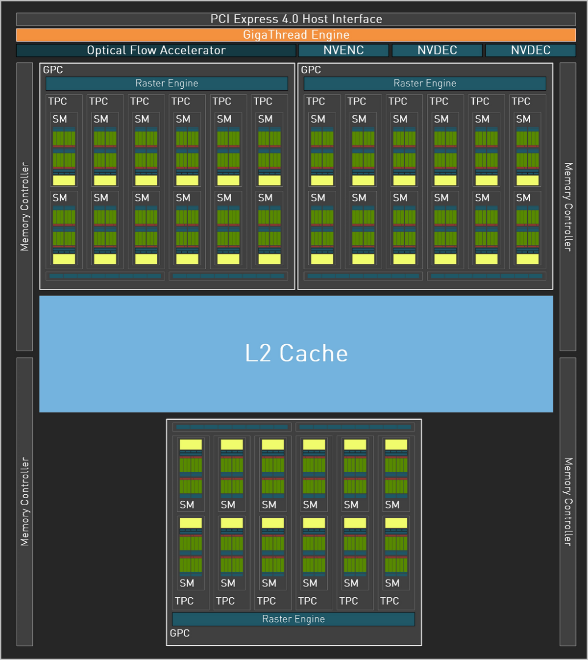 多样的组合让AD106完整形态下拥有4608个CoreCore、144个纹理单元,48个ROPs和36个SM,对应的,也拥有144个第四代TensorCore和36个第三代RTCore。每个SM包含128KBL1缓存,总共拥有32MBL2缓存。