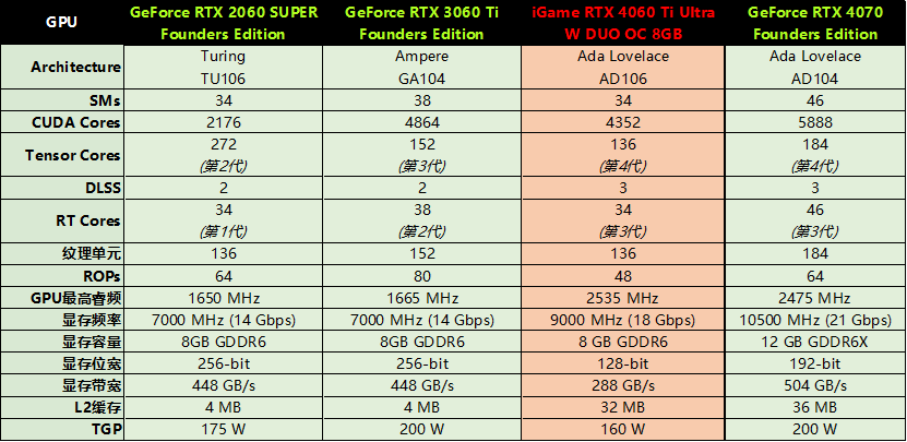 值得说明的是GeForceRTX4060TiFE公版基础频率2310MHz,最高频率为2535MHz,通过iGameRTX4060TiUltraWDUOOC8GB一键超频后可以来到2580MHz,同时GDDR6显存也进行了一定的优化,显存频率达到9000MHz,显存数据传输率为18Gbps,也明显优于RTX3060Ti的14Gbps的GDDR6,为后续不错的性能表现奠定了基础。这里不妨让我们放出对比表格。