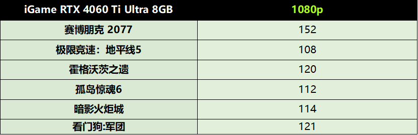 另外值得注意的是,由于略带超频的关系,iGameRTX4060TiUltraWDUOOC8GB的TGP为182W,比公版高出2W,在实际使用过程中基本可以忽略。在NVIDIA给出的功耗参考中可以看到RTX4060Ti的待机功耗为7W,AV1解码播放功耗13W。而实际的游戏功耗也用不着180W,像赛博朋克这种光追特效全开,性能释放拉满的状态,功耗也刚刚超过150W。