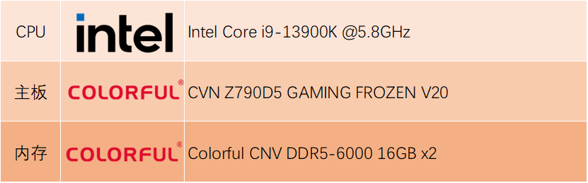 同时按照惯例放出测试平台,硬件阵营包括英特尔Corei9-13900K,七彩虹ColorfulCNVDDR5-600016GBx2,CVNZ790D5GAMINGFROZENV20,以及1250W电源作为支持,同时也引入上一代GPU作为对比。