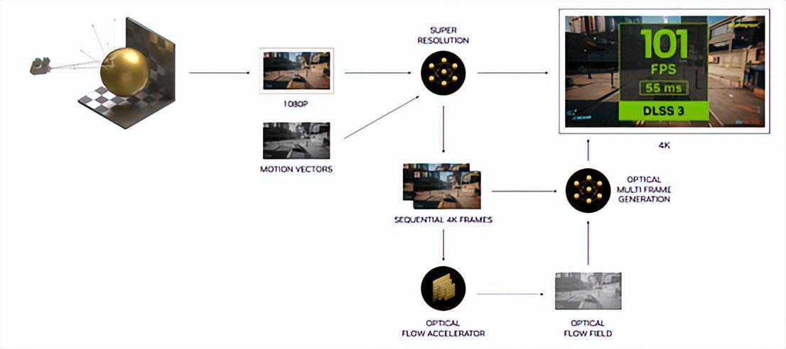 这是一项包含了提升游戏帧率、降低系统延迟的完整解决方案。它通过引入光流加速器(OpticalFlowAcceleration,OFA)与DLSS相结合的办法,构建出了一个更为立体的分析方式,将卷积自编码器的输入源扩展到几个部分,分别是:之前帧与当下帧,由光流加速器生成的光流场、游戏运动矢量和深度等数据。这时候DLSS3甚至承担起渲染过程中7/8的工作,让CPU和GPU进完成其中1/8的渲染即可,从而节省出大量的计算资源专注到更有用的地方。