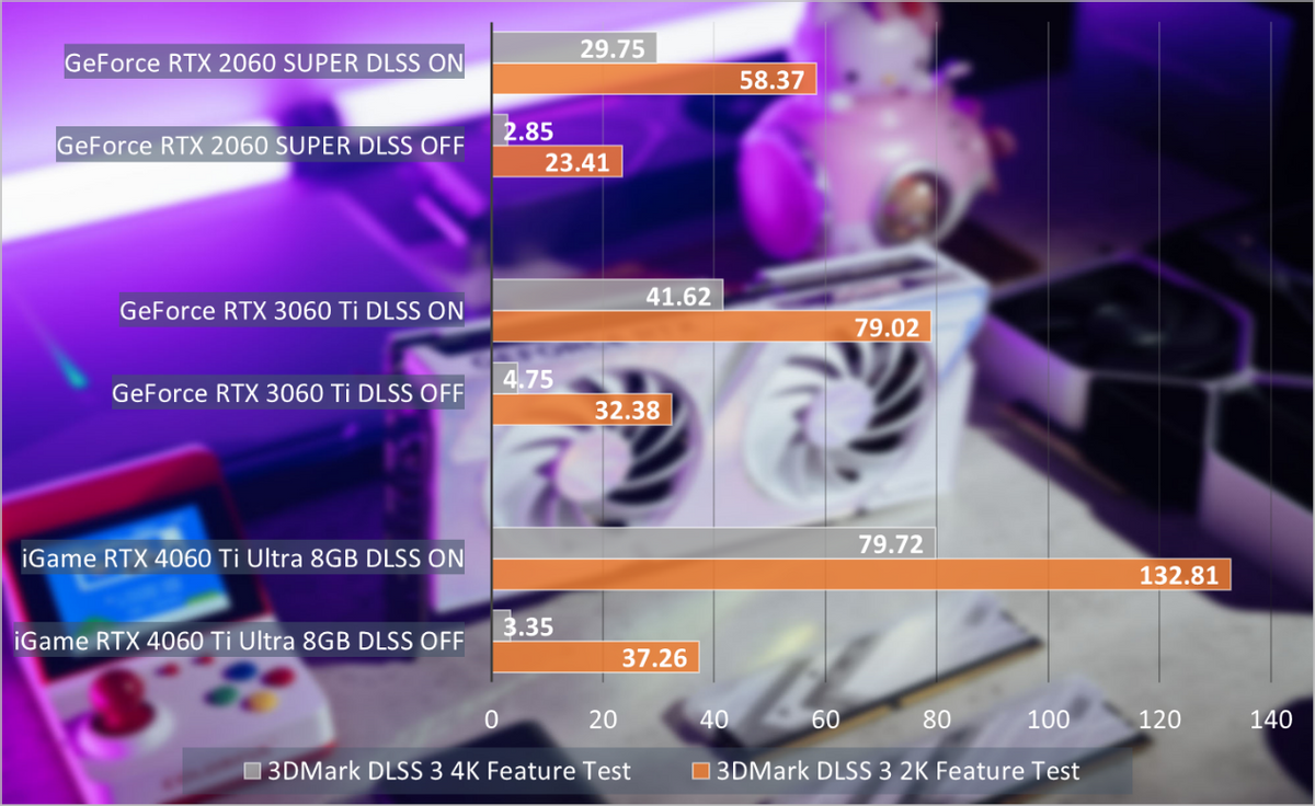 在3DMarkDLSS功能测试中可以很好的证明这一点,在2K分辨率下GeForceRTX4060Ti相对GeForceRTX3060Ti的提升幅度近70%,相对GeForceRTX2060SUPER则提升130%。而在4K分辨率下,提升幅度更夸张,分别达到91%和170%。