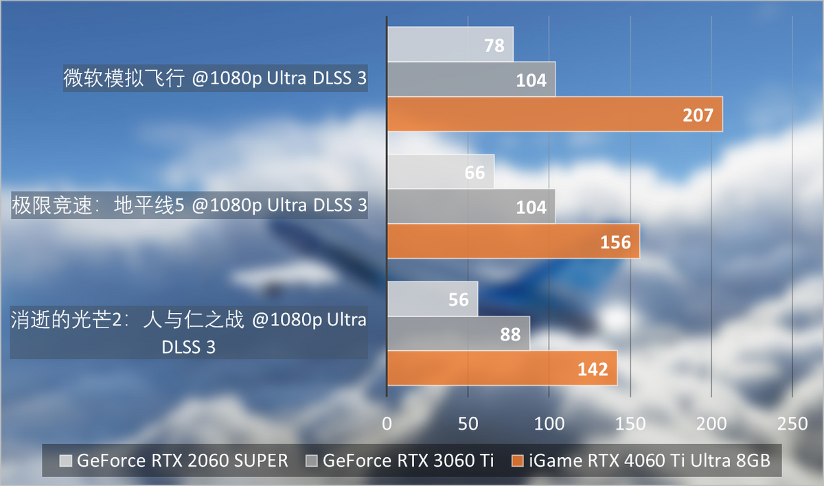 然后是DLSS3游戏测试部分,这里主要在1080p分辨率下进行,所有游戏均开启光线追踪最高画质。其中《微软飞行模拟》提升幅度非常明显,iGameRTX4060TiUltraWDUOOC8GB相对GeForceRTX3060Ti和GeForceRTX2060SUPER分别提升了99%和165%,DLSS3帮助加速了复杂的地面建筑优化,从而拉开了差距。